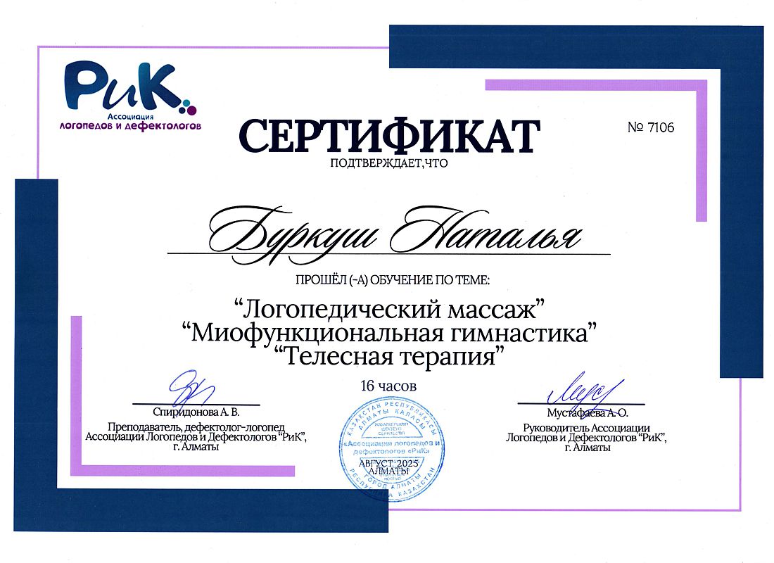 Сначала я устроилась работать в детский центр развития не имея педагогического образования, но с огромной любовью к детям. Поработав 8 месяцев, поступила в Алматинский государственный гуманитарно-педагогический колледж №2, позже закончила курсы логопеда в «Ассоциации Логопедов и Дефектологов», затем прошла курсы детского психолога и получила высшее дополнительное Московское образование по профессии: «Практический психолог. Семейный психолог».
