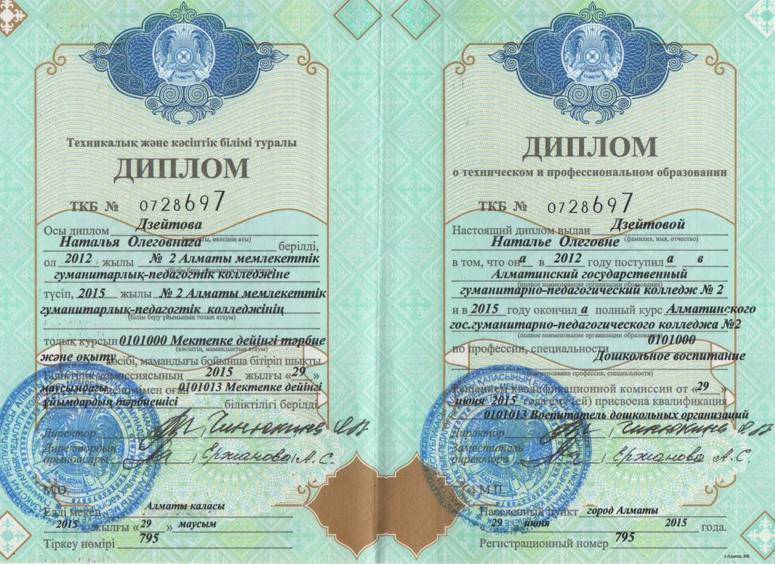 Алматинский государственный гуманитарно-педагогический колледж №2. Диплом о техническом и профессиональном образованиии.