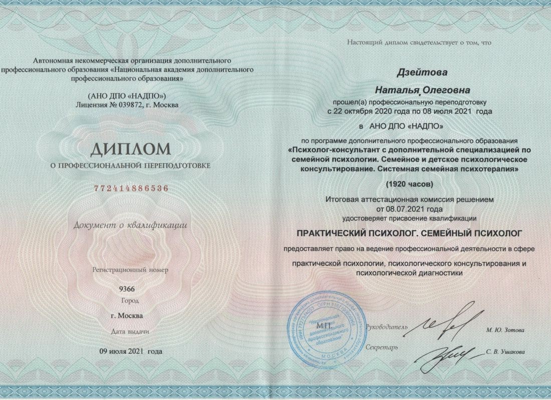 Специальность: "Психолог-консультант с дополнительной специализацией по семейной психологии. Семейное и детское психологическое консультирование. Системная семейная психотерапия".