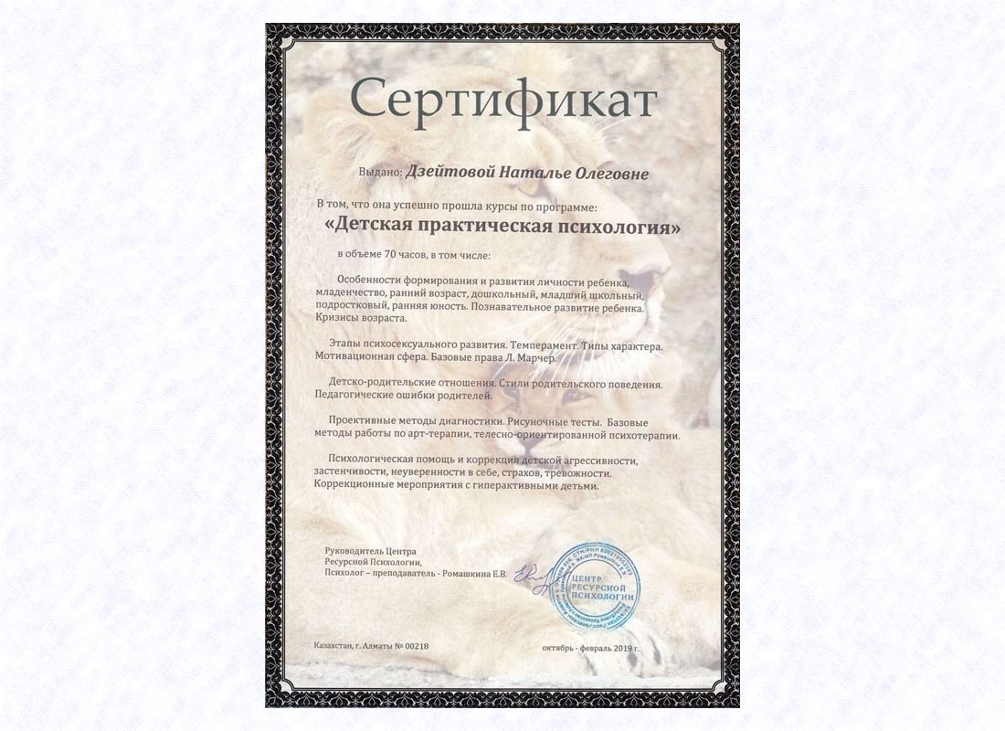 Центр ресурсной психологии. Сертификат о прохождении курса по программе "Детская практическая психология".