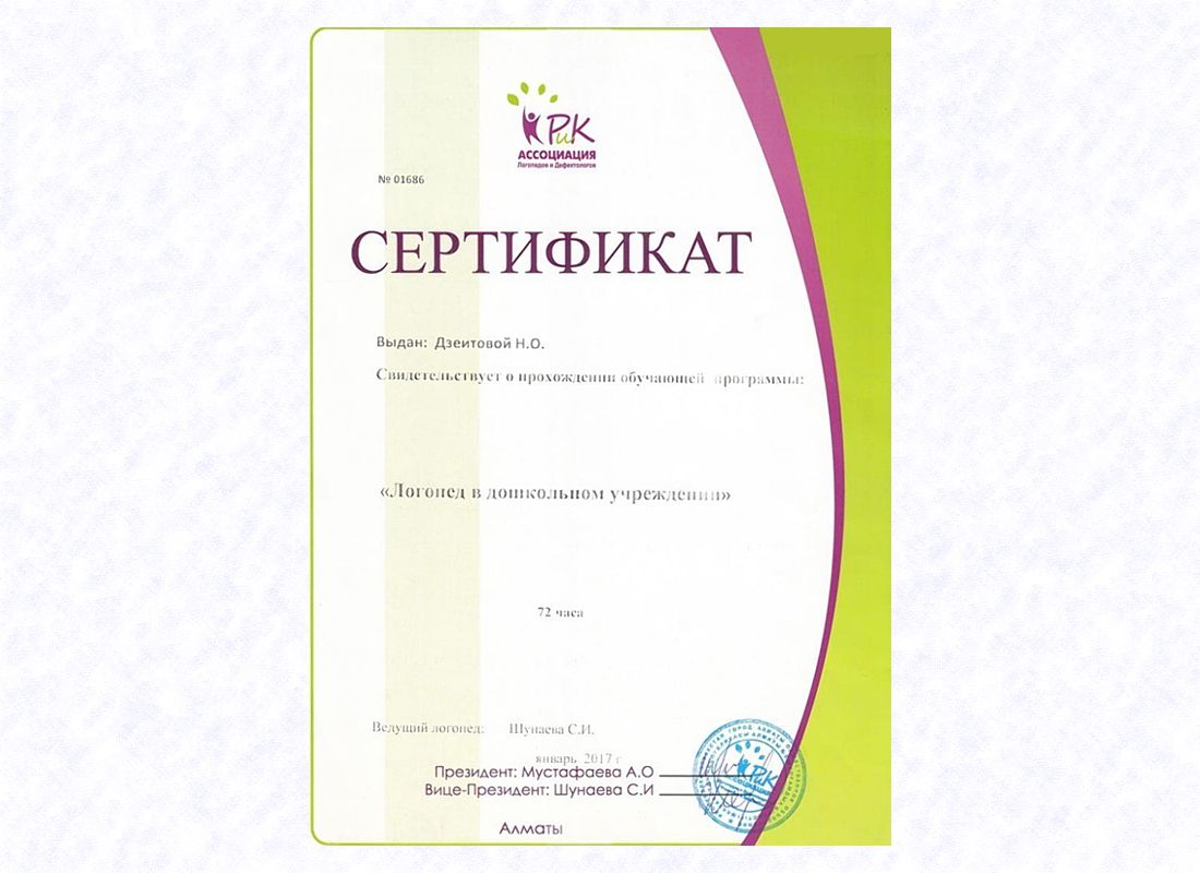 Ассоциация Логопедов и Дефектологов. Сертификат о прохождении обучающей программы "Логопед в дошкольном учреждении".